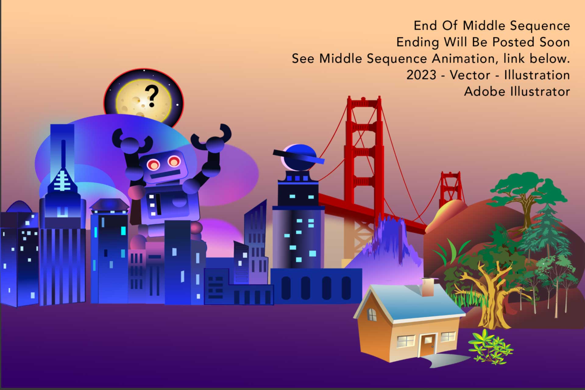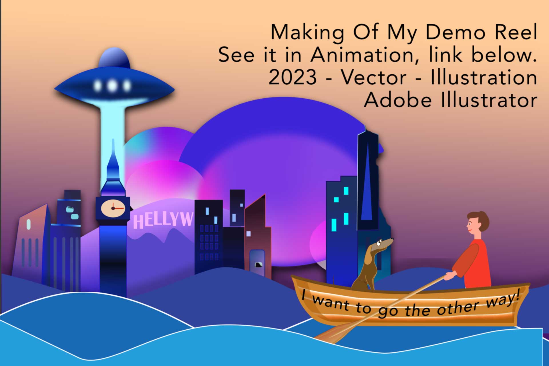 This visually stunning sequence showcases the breadth of my design and animation skills. Created using Illustrator and After Effects, every element in this sequence is thoughtfully crafted, from the 2D water background to the individual assets like the rowboat, oars, the boy and his dog. As the sequence progresses, viewers are treated to a mesmerizing display of landmarks like Seattle’s Space Needle, the Empire State Building, Big Ben, and The Golden Gate Bridge in red, each brought to life with intricate details and animations. Other impressive elements include a Gigantic Robot with moving arms, a volcano on fire and erupting, and even a sinking Titanic. The final shot of the boy and his dog pulling up to a dock on a mountain tunnel opening leaves viewers eagerly anticipating the end sequence. Overall, this sequence exemplifies my artistic creativity, technical prowess, and attention to detail in crafting compelling animation and design.